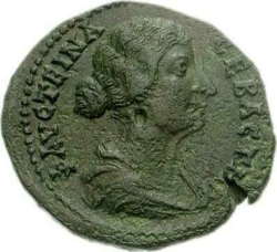 ΦΑΥϹΤΕΙΝΑ ϹΕΒΑϹΤΗ; draped bust of Faustina II, right
