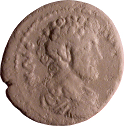 ΑΥΡΗΛΙΟϹ ΚΑΙϹΑΡ; bare head of Marcus Aurelius (short beard), left