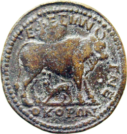 ΕΦΕϹΙΩΝ Γ ΝΕΟΚΟΡΩΝ; cow standing, right, suckling calf, left