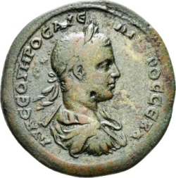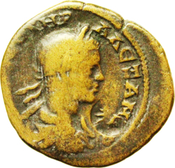 ΑΥ Κ ϹΕ(ΟΥ) ΑΛΕΞΑ(Ν)(Δ); laureate head of Severus Alexander, right