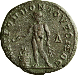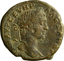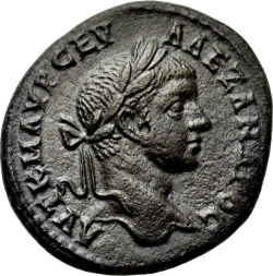 ΑΥΤ Κ Μ ΑΥΡ ϹΕΥ(Η) (or ϹΕΥΗ) ΑΛΕΞΑΝΔΡΟϹ (or ΑΛΕΞΑΝΔΡΟϹ); laureate, draped and cuirassed bust of Severus Alexander, right, seen from rear