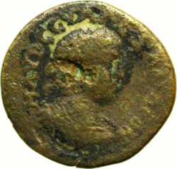 ΙΟΥΛΙΟΠΟΛΕΙΤΩΝ; Nemesis standing facing, looking left, raising her hand to her breast and holding bridle; to left, wheel