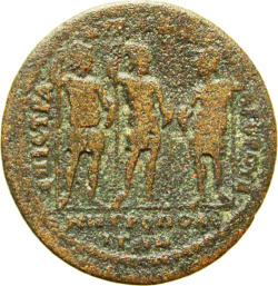 ΕΠΙ ϹΤΡ ΑΥΡ ϹΕΞΤΟΥ Β ΜΗΤΡΟΠΟΛΕΙΤΩΝ; three military figures standing, facing, two looking each other, the third head right, each wearing helmet and resting on spear