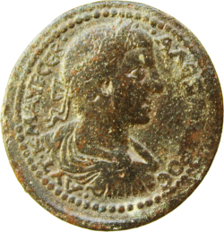 ΕΠ ϹΤΡ Μ ΑΥΡ ΔΑΜΙΑΝΟΥ ϹΑΡΔΙΑΝΩΝ Β ΝΕΩΚΟΡΩΝ; Kore standing facing, having poppy ears on either side