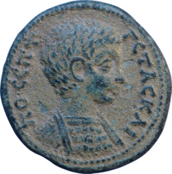 Λ ϹΕΠ ΓΕΤΑϹ ΚΑΙϹ; bare-headed and cuirassed bust of Geta, right, seen from front