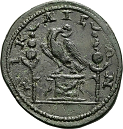 ΝΙΚΑΙΕΩΝ; eagle standing left, head right, on vexillum between two standards