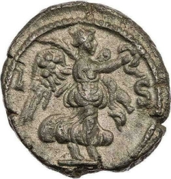 L Ϛ; Nike advancing right, holding wreath and palm