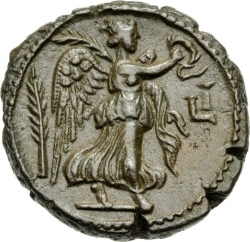 L Ι; Nike advancing right, holding wreath and palm; behind, palm