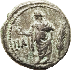 L ΙΒ; Tyche seated left, holding rudder and cornucopia; to right, palm
