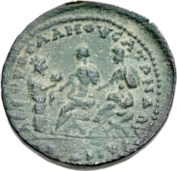 ΑΔΡ ΟΥΑ ΓΑΛ ΜΟΨΕΑΤΩΝ ΔΩΡΕΑΙ ΕΤ ΓΚΤ; Valerian and Gallienus seated beside one another on curule chair; before, city Tyche stands holding prize crown