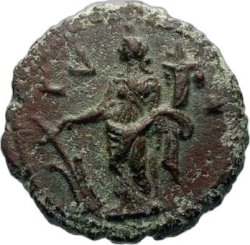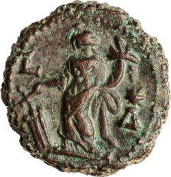 L Δ; Tyche standing left, holding rudder and cornucopia; to right, star