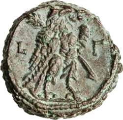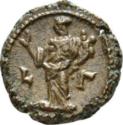 L Γ; Helios standing left holding globe (?) in left and raising right