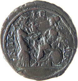 Tyche standing right, holding small temple in each hand, in front of Athena seated left, holding Nike; shield at right