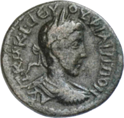 ΑΥ Κ ΜΑΡ ΙΟΥΛ ΦΙΛΙΠΠΟϹ; radiate, draped and cuirassed bust of Philip II, right, seen from rear