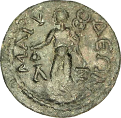 ΜΑΓΥΔΕΩΝ, Λ-Ζ; Hermes standing left, holding purse and caduceus