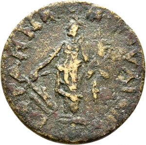 ΗΡΑΚΛΕΩΤΩΝ; emperor standing facing in military dress, looking left, holding globe and long sceptre (?), being crowned with wreath by turreted Heraclea (?) standing facing, head left, behind him