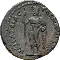 ΚΑΙϹΑΡΕΙΑϹ ΓΕΡΜΑΝΙΚΗϹ; Zeus, wearing himation over left shoulder and lower limbs, standing facing, head left, his right hand resting on sceptre, his left on his hip