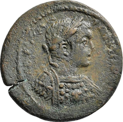laureate bust of Elagabalus, right, wearing cuirass decorated with Gorgoneion, seen from front