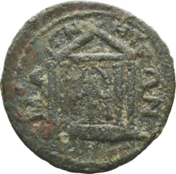 ΕΠΙ Γ ΦΙΛΟΥΜΕΝΟΥ Β ΜΑΓΝΗΤΩΝ; front view of temple with four columns (with shield in pediment), within which Artemis Leukophryene standing, facing, wearing kalathos, having supports, being crowned by Nike flying on either sides; at her feet, eagle with spread wings on either side