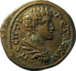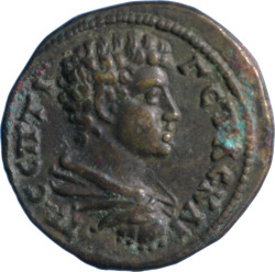 Π ϹΕΠ ΓΕΤΑϹ ΚΑΙ; bare-headed, draped and cuirassed bust of Geta, right, seen from rear