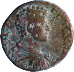 ΗΡΑΚΛΗΑϹ ΕΝ ΠΟΝΤΩ; Dionysus standing facing, head left, holding bunch of grapes (?) and thyrsus (?); at his feet, panther