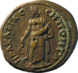ΗΡΑΚΛΗΑϹ ΕΝ ΠΟΝΤΩ; Asclepius standing facing head left resting on serpent staff with his right