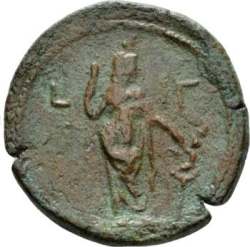 L ΙΓ; Isis, crowned with disc, standing facing, head right, raising hand; to right, lotus flower with small figure of Harpocrates