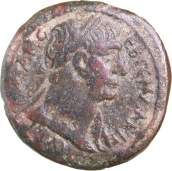 L ΙΓ; Sarapis seated, left, holding sceptre; to left, small Cerberus; to left, Demeter standing facing, holding torch; to left, kneeling figure; to right, Hermes standing, left, holding caduceus; above, two Nikai (?) holding bust (?)