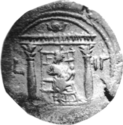 L ΙΓ; temple (Greco-Egyptian) with two columns enclosing Isis seated, right; on knee, Harpocrates, raising hand