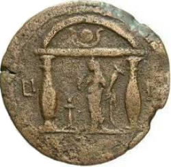 L ΙΓ; temple (classical) with four columns enclosing Apollo standing facing, head right; to left, tripod
