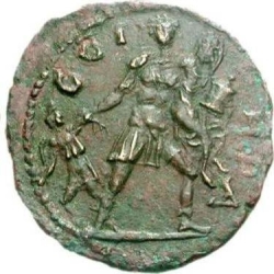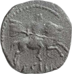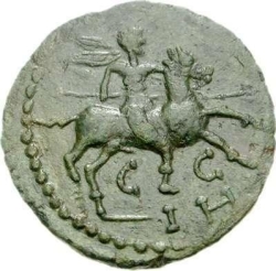 C C I C I [ ] (?); emperor riding on horse right, cloak billowing behind, holding long spear