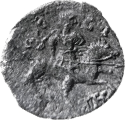 C C I H (P); emperor riding on horse right, cloak billowing behind, holding long spear