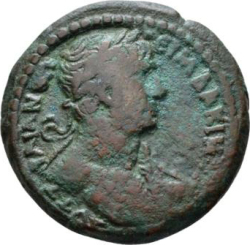 L ΙϚ; Athena standing, right, holding shield and spear; to right, Ares standing, left, holding spear and parazonium