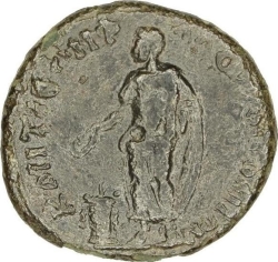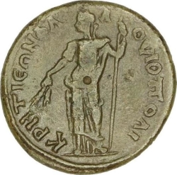 ΚΡΗΤΙΕΩΝ ΦΛΑΟΥ; Athena standing facing, head left, holding patera in her right hand, her left resting on sceptre; at her feet, shield