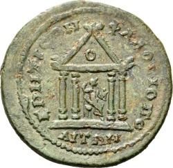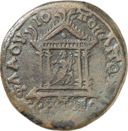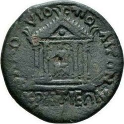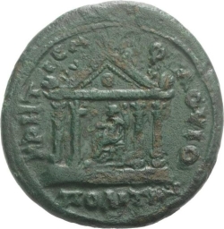 ΚΡΗΤΙΕΩΝ ΦΛΑΟΥΙΟΠΟΛΙΤΩΝ; temple with four columns with which statue of Zeus seated, left, holding patera and resting on sceptre; pellet in pediment