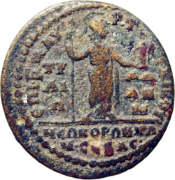 [ ] [ΔΙΟ]ϹΚΟΥΡΙΔΟΥ, ΤΡΑ/ΛΙΑ/ΝΩΝ ΝΕΩ/ΚΟ/ΡΩΝ (in six lines in l. field), Τ/ΩΝ/ ϹΕ/Β (in r. field); Helios standing left, raising hand and holding globe