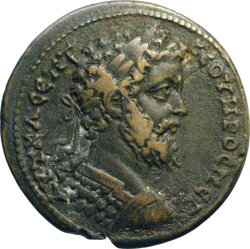 Æ (36 mm) 																							  Λ ϹΕΠ ϹΕΟΥΗΡΟϹ;  laureate, draped and cuirassed bust of Septimius Severus, right, seen from rear  ΕΠΙ Τ Φ ΛΕ ΙΕΡΑΚΟϹ ϹΤΡ ΤΟ Β Α, ΥΠΑΙΠΗΝΩΝ;  Septimius Severus galloping right, brandishing spear at kneeling captive beneath horse