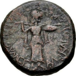 Asclepius (?) seated left, his left arm resting on sceptre, his right hand towards a serpent in front of him