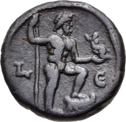 L Ε; Poseidon, nude, standing with foot on prow, left, holding dolphin and trident