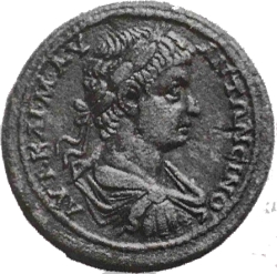 ΠΟ ϹΕΠΤΙ ΓΕΤΑϹ ΚΑΙ; bare-headed, draped and cuirassed bust of Geta, right, seen from rear