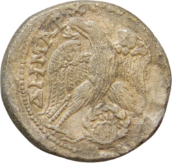 ΔΗΜΑΡΧ ΕΞ ΥΠΑ Το Δ; eagle standing facing, head and tail left, with wings spread, holding wreath in beak; between legs, the three Charites within wreath