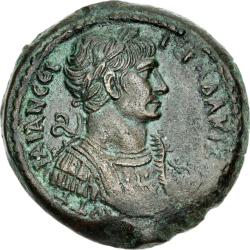 ΑΥΤ ΤΡΑΙΑΝ ϹΕΒ ΓΕΡΜ ΔΑΚΙΚ; laureate half-length nude bust of Trajan, right, with aegis on, left, shoulder