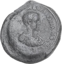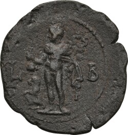 L - Β; Hermes standing facing, head left, holding caduceus and purse, in field left baboon