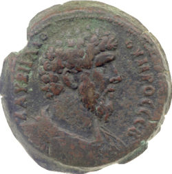 Λ ΑΥΡΗΛΙΟϹ ΟΥΗΡΟϹ ϹΕΒ; bare head of Lucius Verus with traces of drapery, right