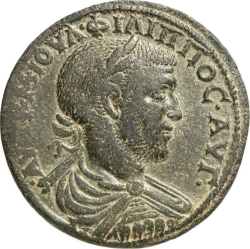ΑΥΤ Κ ΙΟΥΛ ΦΙΛΙΠΠΟϹ ΑΥΓ; laureate, draped and cuirassed bust of Philip I, right, seen from rear