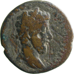 [IMP CAES M AVRE] ANΤ[ONIN][VS AVG?]; bare head of Marcus Aurelius (long beard with short curls?) with traces of drapery, right