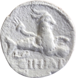 C G I H PAR; Parios(?) on horse rearing, right, holding spear