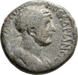 ΑΥΤΟΚΡ ΚΑΙϹ ΤΡΑΙΑΝΟϹ ΑΔΡΙΑΝΟϹ; laureate head of Hadrian, right, with drapery on far shoulder