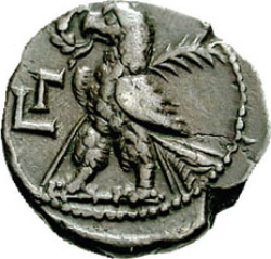 L Γ; eagle standing left, holding wreath in beak; palm branch behind wing