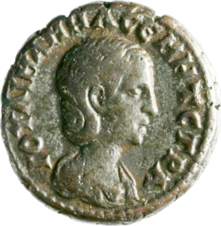 ΙΟΥΛ ΜΑΜΗΑ ϹΕΒ ΜΗΤ ϹΤΡΑ; draped bust of Julia Mamaea, right